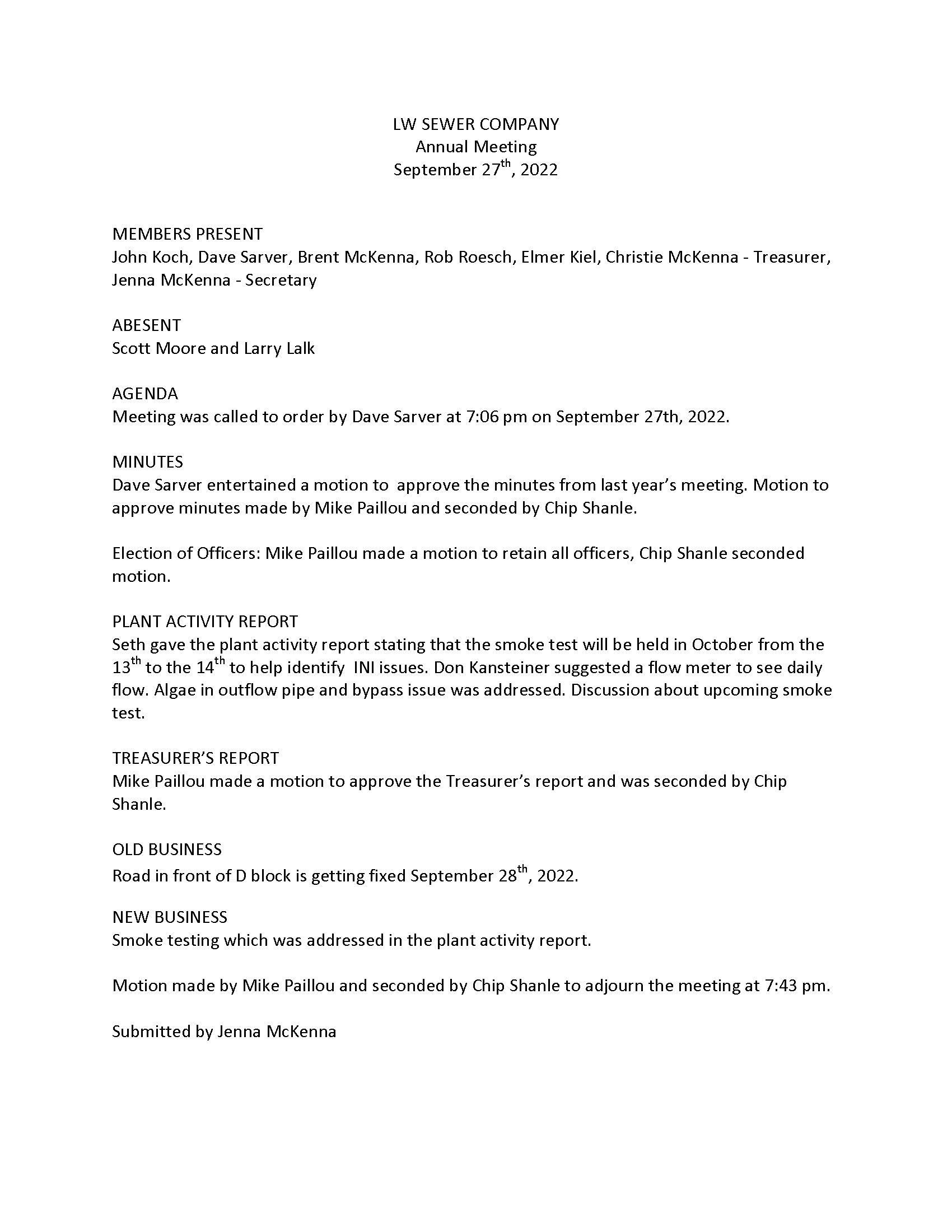 The below 2022 Annual Meeting Minutes are the final minutes and were approved at the 2023 Annual Meeting on 09/26/2023.